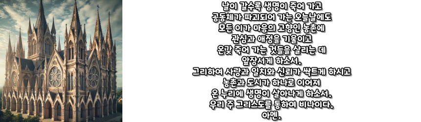 우리의 식탁에 놓인 모든 음식은 농민의 손길과 하느님의 축복이 만나 이루어진 기적입니다. 이 기도를 통해 농민들이 하느님의 은총 속에서 희망을 잃지 않고, 더 나은 세상을 만들어갈 수 있기를 바랍니다.